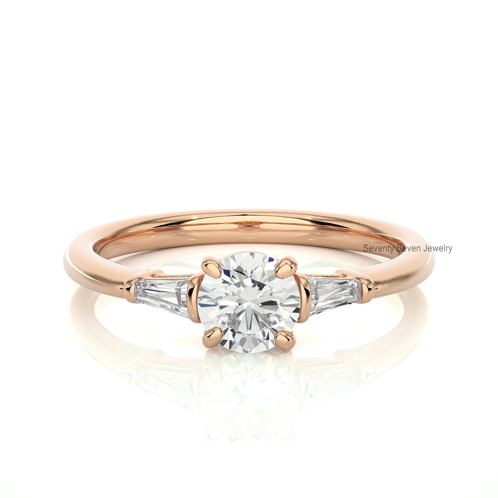 We are presenting our 14K Gold Trio Stone Moissanite Ring, Tapered Baguette Ring 9K, Triple Stone Wedding Ring, Wedding Ring By SeventySeven Jewelry Gift